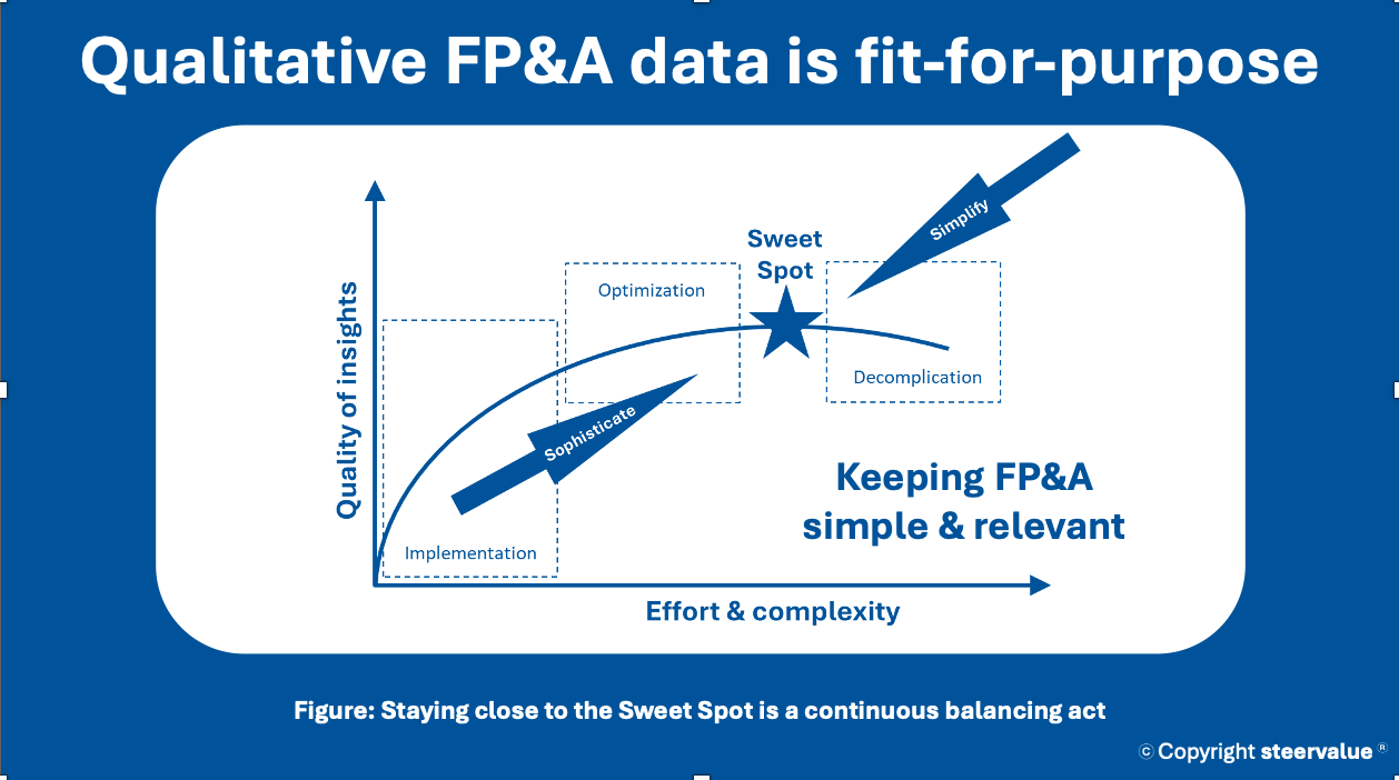 Het vinden van de juiste balans kan een uitdaging zijn. Het hangt af van het bedrijfsmodel, het tempo van de besluitvorming en de volwassenheid van de systemen. FP&A speelt een cruciale rol bij het definiëren van wat ‘kwalitatieve data’ inhoudt en of het ‘fit-for-purpose’ is.
