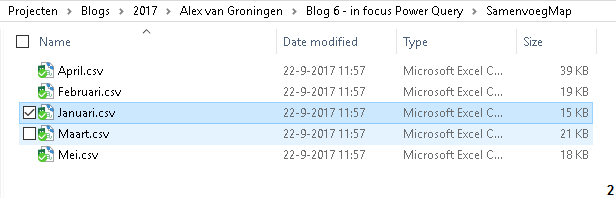 In afbeelding 1 zie je een van de tekstbestanden in Excel 2016: de informatie over de maand Januari. Je gebruikt een map waarin je alleen de tekstbestanden plaatst (afbeelding 2). Ieder maand voeg je het nieuwe bestand toe en druk je op de knop Verversen. Miraculeus wordt de informatie van de nieuwe maand aan de bestaande lijst toegevoegd. Wil je bepaalde maanden niet in de lijst hebben (bijvoorbeeld omdat het de maanden van vorig jaar zijn), dan haal je de niet gewenste bestanden gewoon uit de map.