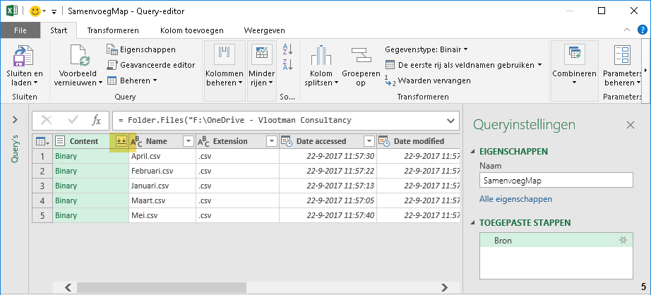 Het venster van de Query-editor opent. Richt je aandacht op de filterknopjes in de koprij van de tabel. Je ziet bij een aantal kolommen de vertrouwde filterknoppen, maar bij andere ook uitklapknoppen. Wat je doet is klikken op de uitklapknop van de kolom Content (afbeelding 5). Je krijgt een voorbeeld van de tabel die je kunt verwachten (afbeelding 6). Pas, indien nodig, het scheidingsteken aan naar puntkomma. Vervolgens krijg je een query, die vernoemd is naar de naam van de map.