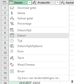 De eerste kolom met de bestandsnaam verwijder je. Daarvoor kies je in het tabblad Start voor Kolommen verwijderen, kolommen verwijderen (afbeelding 7). Vervolgens zet je de kolom Datum in het juiste data type. Klik op de data type knop en kies voor Datum (afbeelding 8). Let ook op de data types van de overige twee kolommen. Verander het data type, indien nodig, in Tekst en Geheel getal. Je kiest in het tabblad Start voor de onderkant van de knop Sluiten en laden, de optie Sluiten en laden naar. Om de query af te sluiten klik je op de knop Laden (afbeelding 9). Uiteindelijk is de complete tabel terug te vinden in Excel (afbeelding 10).